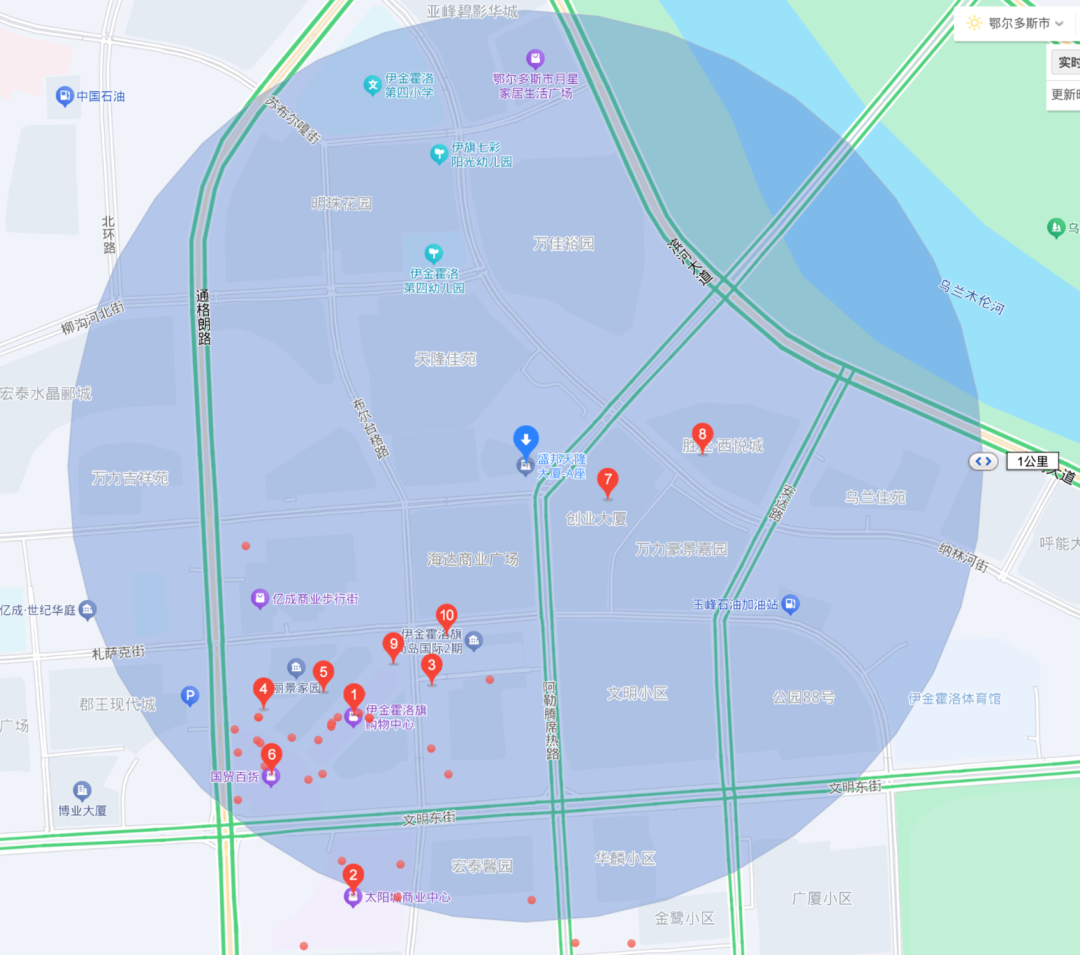 从地理位置来看,阿勒腾席热路横跨乌兰木伦河,是鄂尔多斯核心主干道之一。道路向北延伸至乌兰木伦桥,直达康巴什新区;向南则连通伊金霍洛旗核心城区。每逢节假日,康巴什会举办音乐喷泉表演及其它演出,伊金霍洛旗也会开展一些大型民俗活动(如元宵节赏花灯等),届时阿勒腾席热路人流、车流量均会显著倍增。